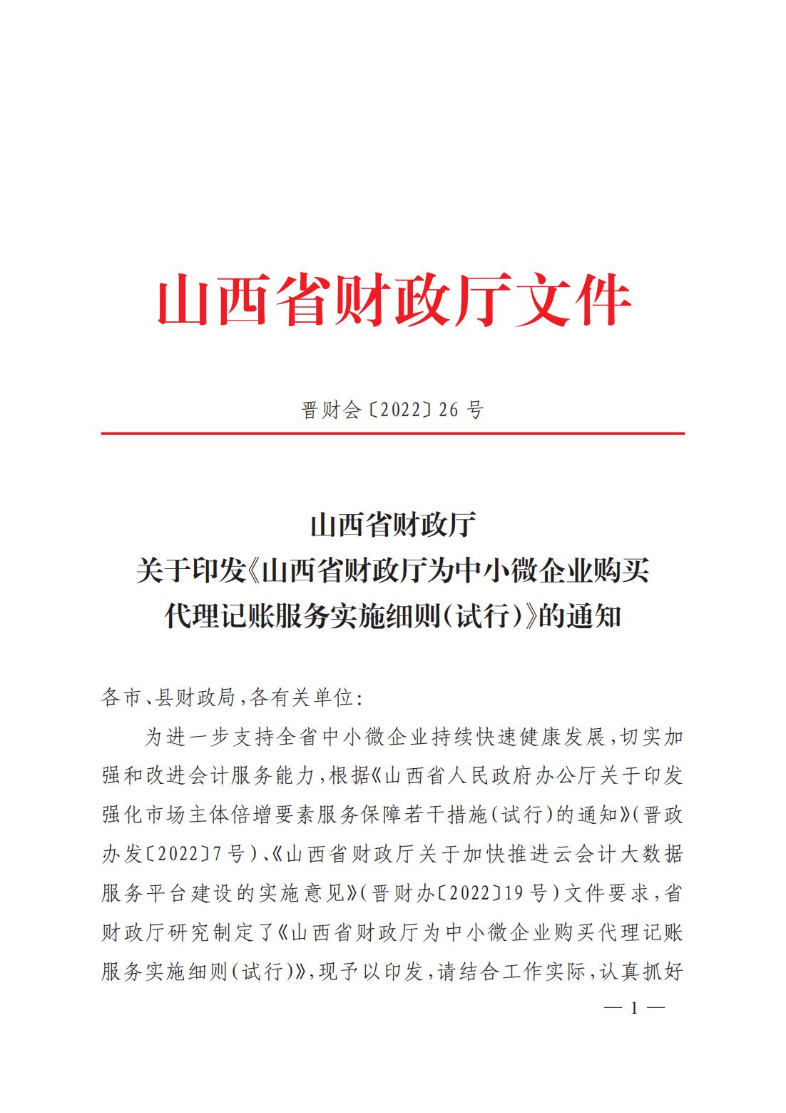 關(guān)于印發(fā)《山西省財政廳為中小微企業(yè)購買代理記賬服務實施細則(試行)》的通知